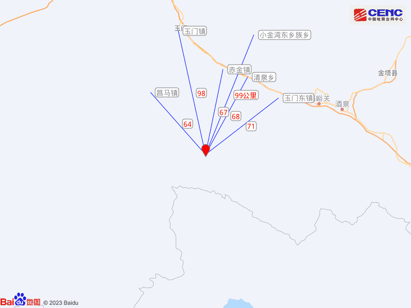 周边县城:震中距嘉峪关市95公里、距玉门市98公里、距肃州区111公里、距金塔县152公里、距瓜州县176公里,距嘉峪关市95公里,距西宁市503公里。