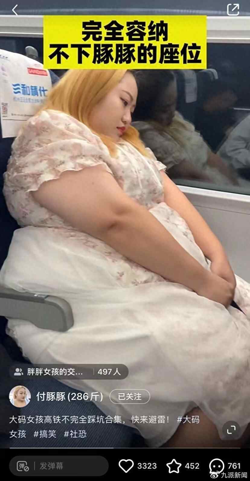 身高170cm、体重286斤的付豚豚需要靠硬挤才能坐到座位上,整个人会被卡住,小桌板放不下来,虽然已经尽量紧靠窗边缩小体积,但身体还是会超出座位打扰邻座。有人指责她挤占了过多的空间,她提议高铁是否可以针对大码人群,在商务座和一等座之间开设较宽敞一些的座位。