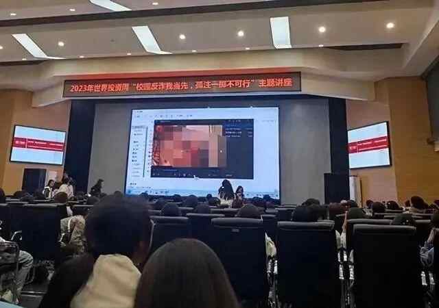 网传信息显示,事发时间疑为10月25日,讲座的主题为“2023年世界投资周‘校园反诈我当先,孤注一掷不可行’主题讲座”。多个拍摄角度的照片显示,在该讲座上,大屏幕中播放不雅视频画面,现场有很多学生,其中部分学生站起身来。