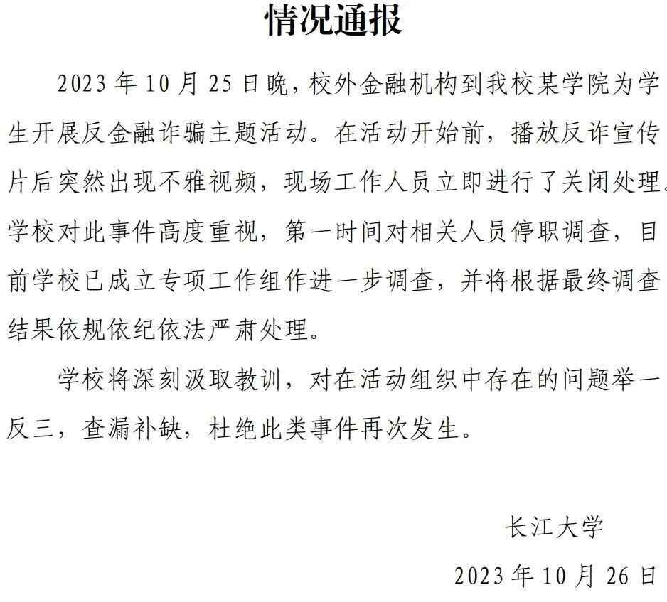 10月26日,网传长江大学荆州校区讲座大屏幕出现不雅视频,引起广泛关注。记者从长江大学经济与管理学院了解到,当日下午,该校正在紧急开会研究此事件。湖北荆州市御路口派出所告诉记者,目前该所民警已到学校展开调查,尚不清楚具体情况。