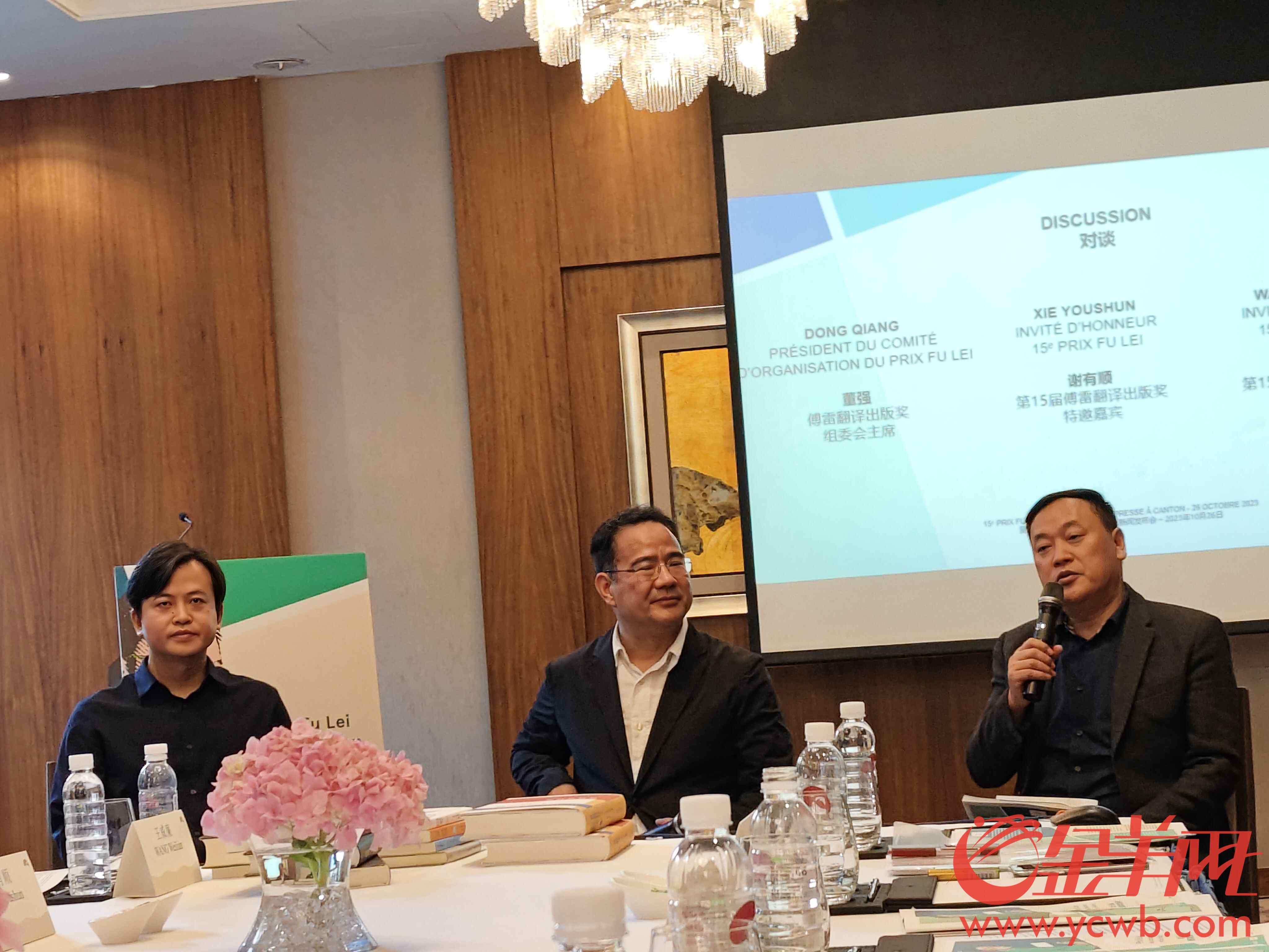 傅雷翻译出版奖组委会主席董强(中)与文学评论家谢有顺(右)和作家王威廉(左)进行对谈