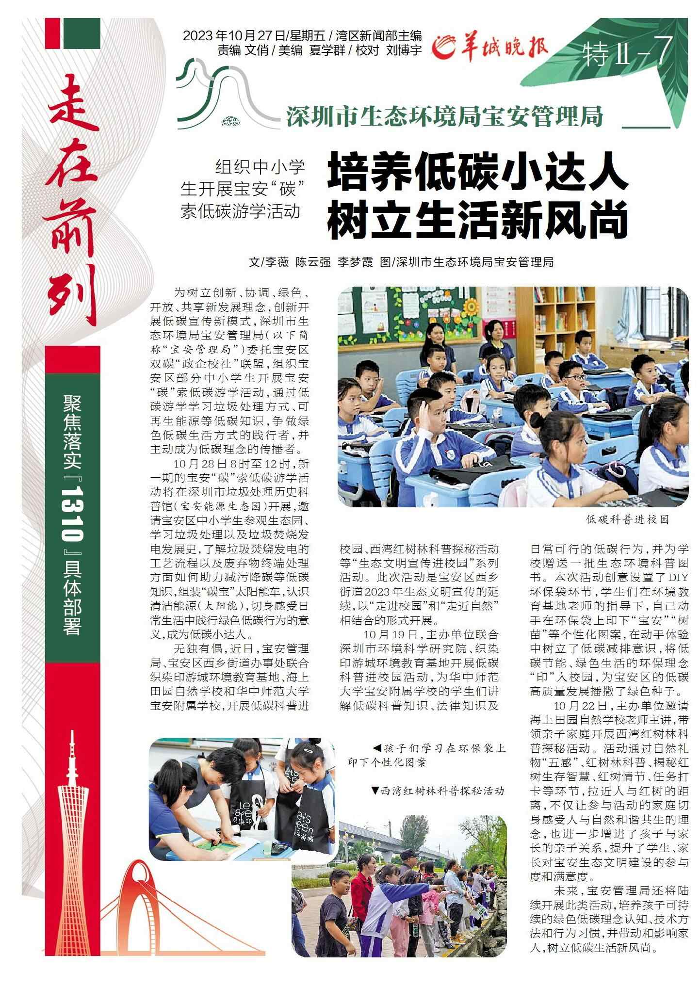 为树立创新、协调、绿色、开放、共享新发展理念,创新开展低碳宣传新模式,深圳市生态环境局宝安管理局(以下简称“宝安管理局”)委托宝安区双碳“政企校社”联盟,组织宝安区部分中小学生开展宝安“碳”索低碳游学活动,通过低碳游学学习垃圾处理方式、可再生能源等低碳知识,争做绿色低碳生活方式的践行者,并主动成为低碳理念的传播者。