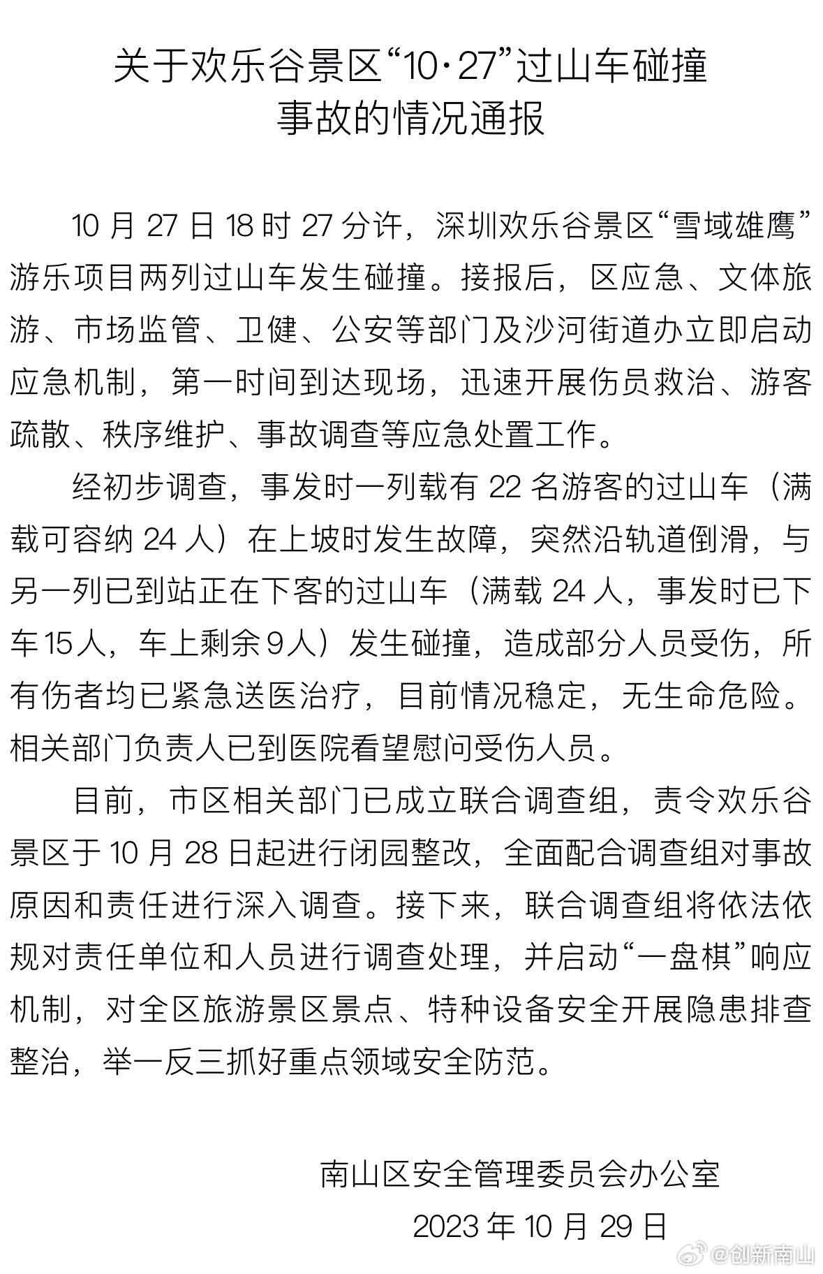 10月29日上午,@创新南山发布关于欢乐谷景区“10.27”过山车碰撞事故的情况通报,全文如下: