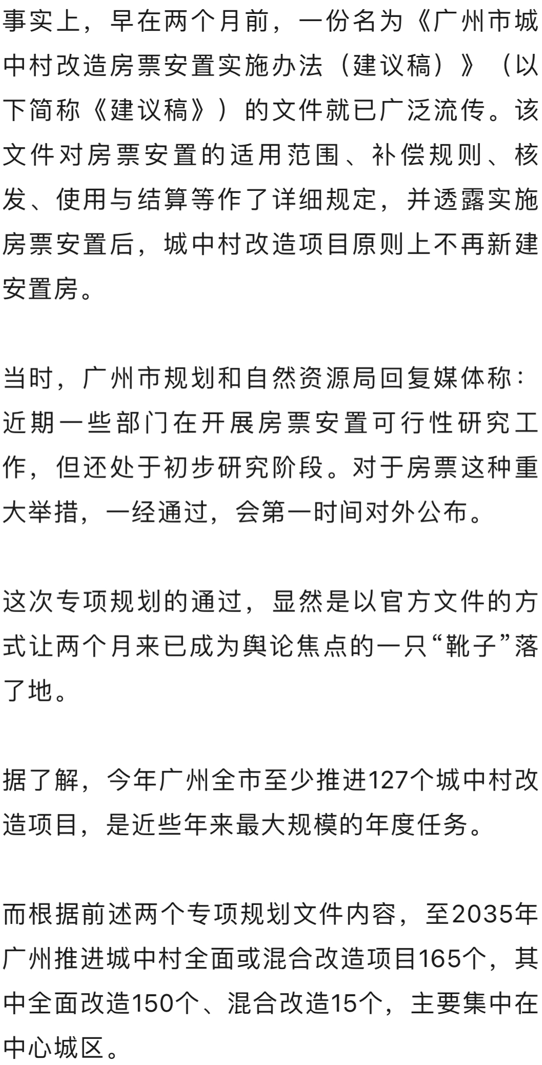 记者注意到,此前市场流传的《建议稿》内容显示,房票安置适用于广州市行政区内各类城中村改造项目的拆迁安置工作,包括政府收储、统筹做地和“三旧”改造等不同模式下的城中村改造项目。