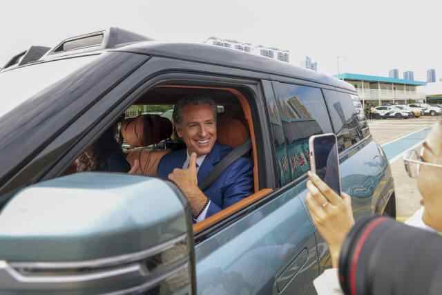 △在深圳,纽森现场试乘比亚迪电动汽车。