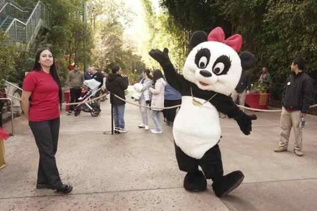 △今年2月4日,在美国加州圣迭戈动物园,一名装扮成熊猫的工作人员在春节庆祝活动上欢迎游客。