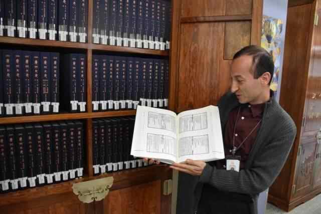 △今年4月20日,一名图书管理员在美国洛杉矶公共图书馆的中央图书馆展示《广州大典》。新华社发
