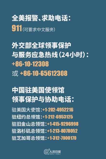 日前,美国多地接连发生枪击事件。中国驻美国使领馆提醒在美中国公民,请密切关注所在地区安全形势,谨慎前往人员密集场所。加强自我安全防范意识和能力,了解掌握必要应急处置和逃生技巧。如遇紧急情况及时报警,并与中国驻美使领馆联系寻求协助。
