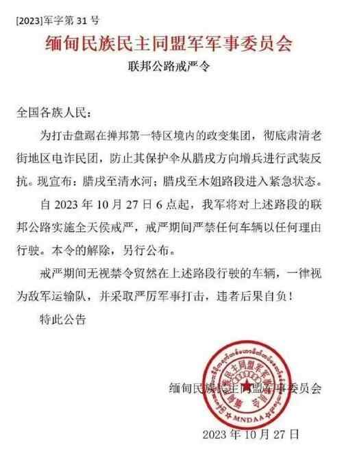 缅甸局势一直冲突不断,这次是从10月27日开始,果敢民族民主同盟军(果敢同盟军)袭击缅甸政府军事据点。当天凌晨4时许,果敢同盟军在掸邦清水河、滚弄、腊戌等多个地方对军事部署区、警察哨所、收费站等据点发动攻击。5时许,包括清水河、滚弄等多个战略据点均被果敢同盟军占领。