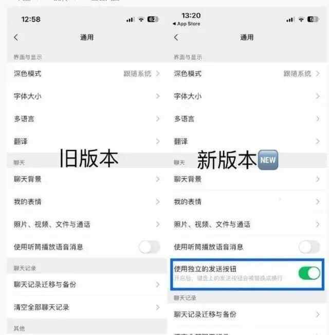 更新后在【微信】-【我】-【设置】-【通用】-(新增)【使用独立的发送按钮】,默认关闭,手动开启后,键盘上的发送按钮就会替换成换行。