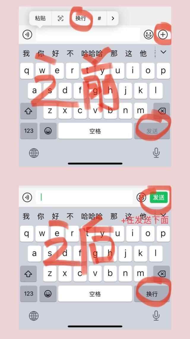 开启后,iPhone自带输入法原来的“发送”变成了“换行”,对话框右侧是发送键,可以实现一键回车换行了。对iOS微信+苹果自带输入法用户来说属实是史诗级更新了。