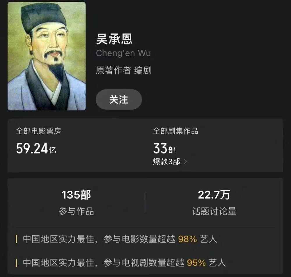 据猫眼专业版数据统计,中国明代杰出小说家吴承恩为中国电影贡献了近60亿的票房,“参与”作品135部,其中电影数量超过了98%的艺人,电视剧数量超过95%的艺人。贡献了《大话西游之月光宝盒》《西游记之大圣归来》等许多优秀电影作品。