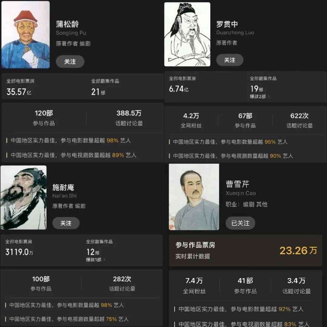 此外,数据统计还显示蒲松龄参与作品120部,罗贯中参与作品67部,施耐庵参与作品100部,曹雪芹参与作品41部。