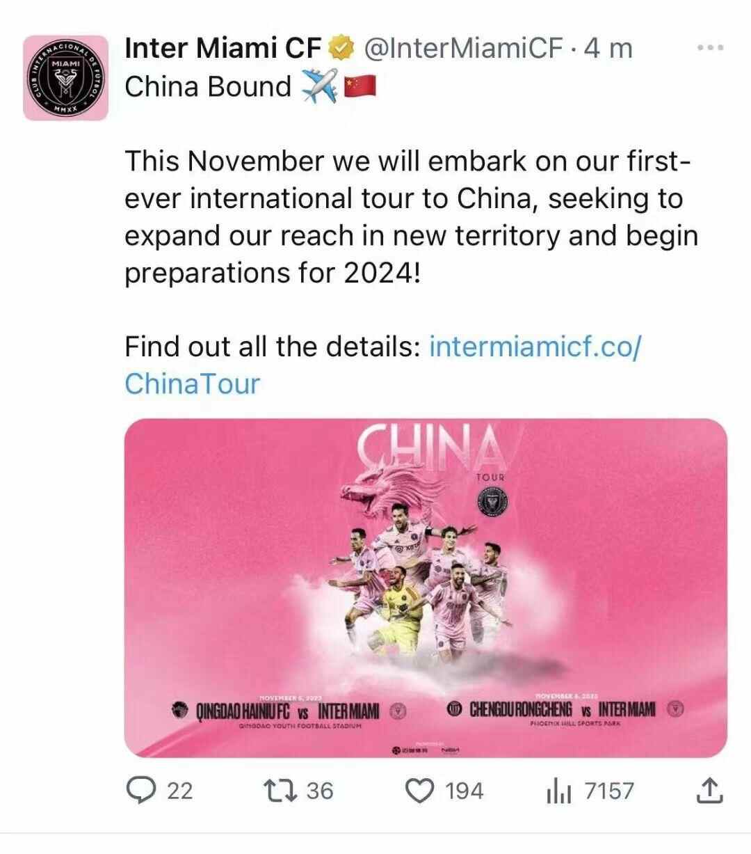 迈阿密国际官方写道:“启程,目的地中国!今年11月,我们将开启首次中国行,寻求拓展新的疆域,并为2024年新赛季做准备!”