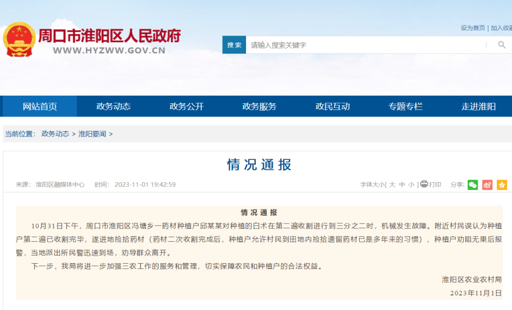11月1日,周口市淮阳区农业农村局发布情况通报称,是村民误认为种植户第二遍已收割完毕,遂进地捡拾药材。种植户劝阻无果后报警,民警迅速到场,劝导群众离开。