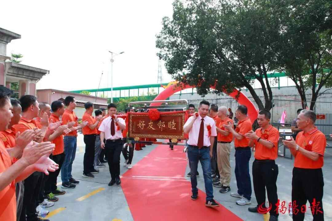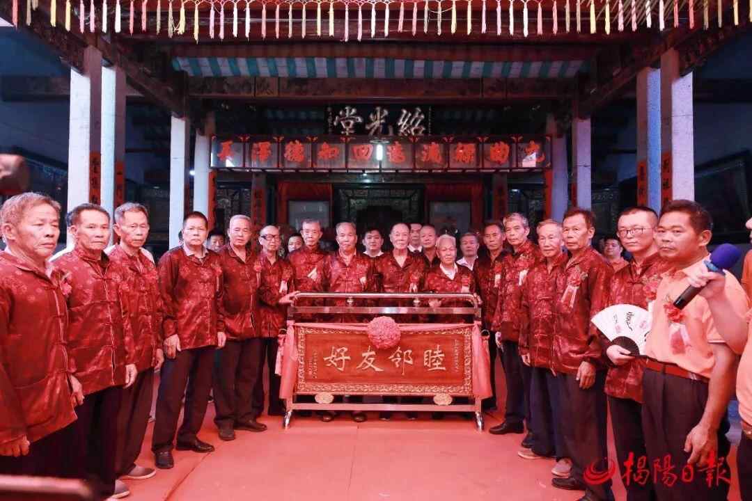 10月1日上午,榕城区仙桥街道槎桥村、美西村、美东村、下六村张灯结彩、彩旗飘扬、鼓乐喧天,处处洋溢着浓厚的喜庆氛围。在这一天,4个村的睦邻友好仪式在4村同步隆重举行,各村派出由村干部、乡贤、长者等组成的代表团,前往其他3村祠堂进行互访,互赠“睦邻友好”牌匾,正式废除互不通婚陈规,结为睦邻友好乡村。