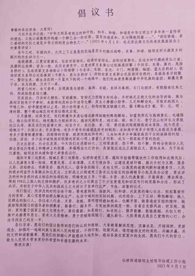 日前,广东揭阳市榕城区仙桥街道槎桥村、美西村、美东村、下六村4个“世仇村”成功破冰和解,正式破除百余年来互不通婚、互不结亲的陈规旧俗,结为睦邻友好乡村,共同推进美丽乡村建设。