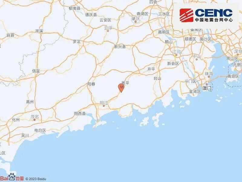中国地震台网正式测定:11月04日19时24分在广东江门市恩平市(北纬22.08度,东经112.25度)发生4.3级地震,震源深度8千米。