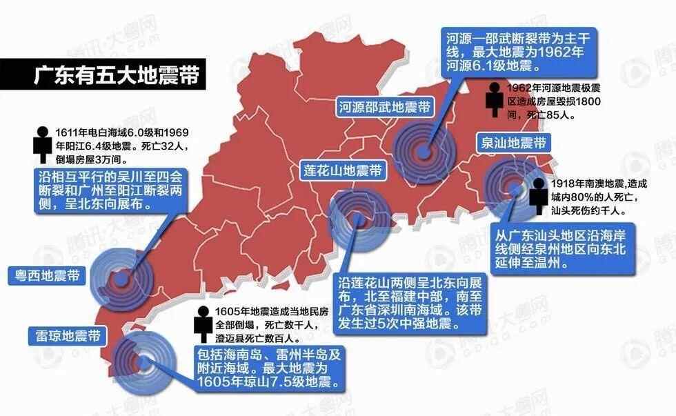 在广东,河源是高频发地震区,52年来共发生地震近3万次,换句话说,广东过半的地震发生在河源;其次是阳江、汕头、韶关,江门排在第5位。