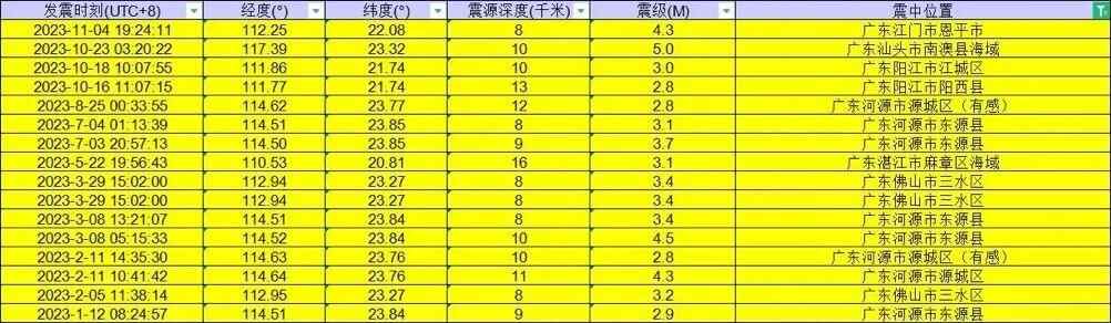 今年以来广东2.5级以上地震数据。图/国家地震科学数据中心