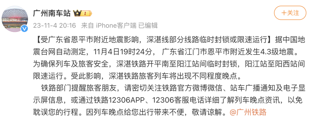 另据@广州南车站 消息,为确保列车及旅客安全,深湛铁路开平南至阳江站间临时封锁,阳江站至阳西站间限速运行。受此影响,深湛铁路旅客列车将出现不同程度晚点。