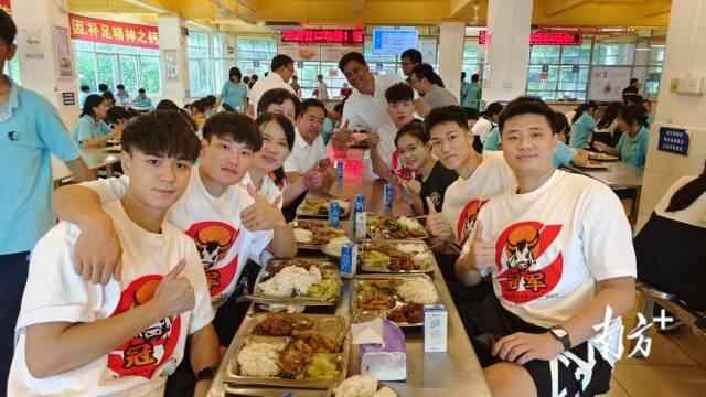 球员们在母校食堂用餐时的合影。