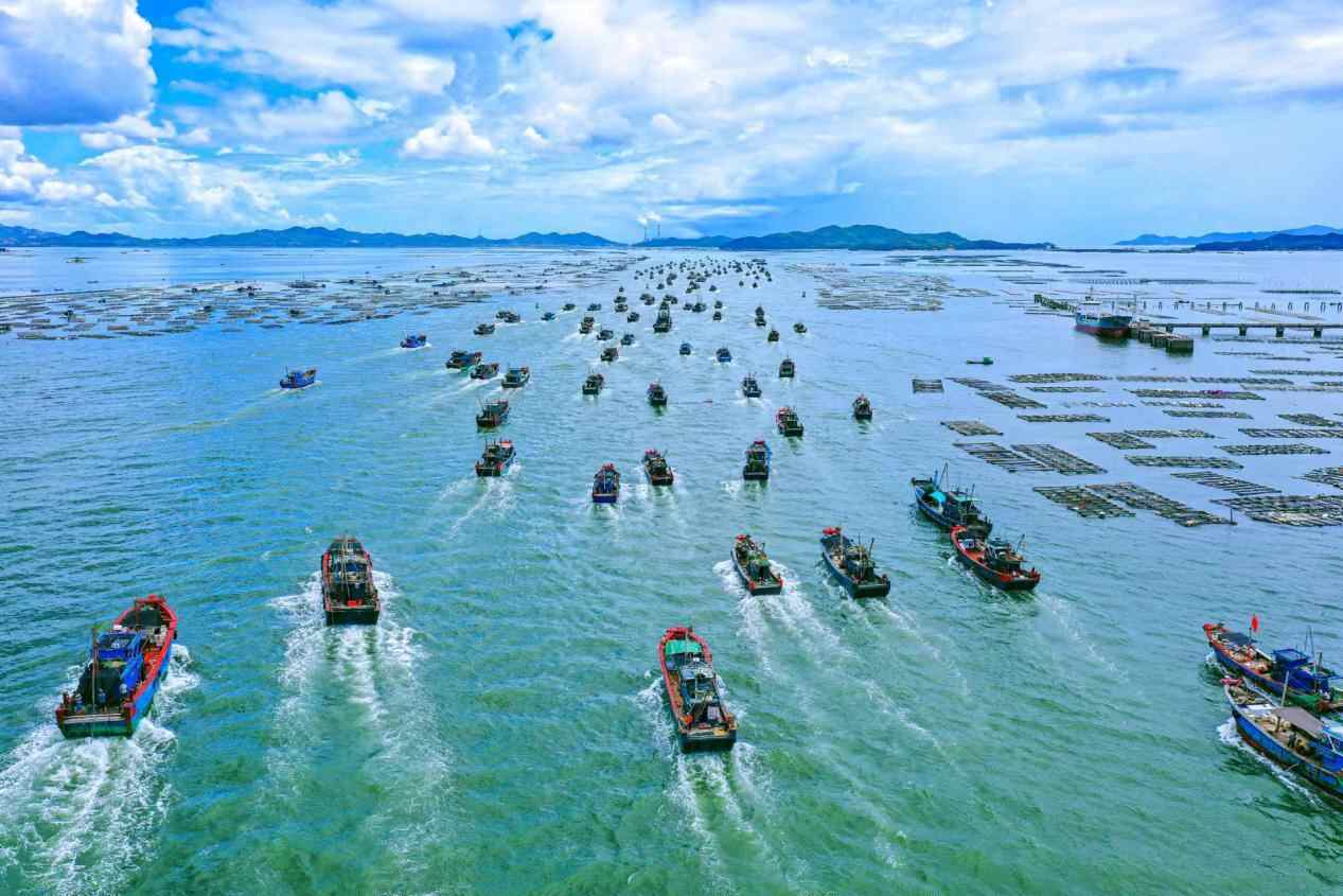 碧波万顷,海水荡漾,柘林湾的海面上,一个个深海养殖网箱星罗棋布,蔚为壮观。海鮸、花鲈、石斑鱼等20多种海水鱼类在这里的仿自然生境中进行人工饲养,渔民们在“蓝色牧场”上忙着喂养管理、拉网捕捞,将产出的海鱼销往全国各地……