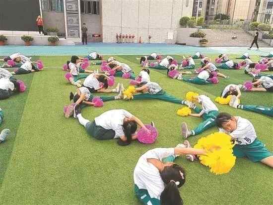 省实荔湾二小大课间的啦啦操不仅孩子们喜欢跳,学校老师也跳得不亦乐乎,“调动老师的积极性非常重要,对于老师来说,这套操简单易学,而且随时随地都能跳,特别适合日常的运动。”林琳说,学校每天会保证学生1.5小时的户外运动,除了大课间的半小时外,下午还有阳光体锻,课间10分钟老师也从来没有规定孩子们不能离开教室,“相反,我们是鼓励学生走出教室,并创造课间活动的条件。在楼道宽敞的空间,都安排放置了做仰卧起坐的垫子,有的同学会利用课间10分钟练习仰卧起坐,也有的同学会去跳绳或下棋等。”