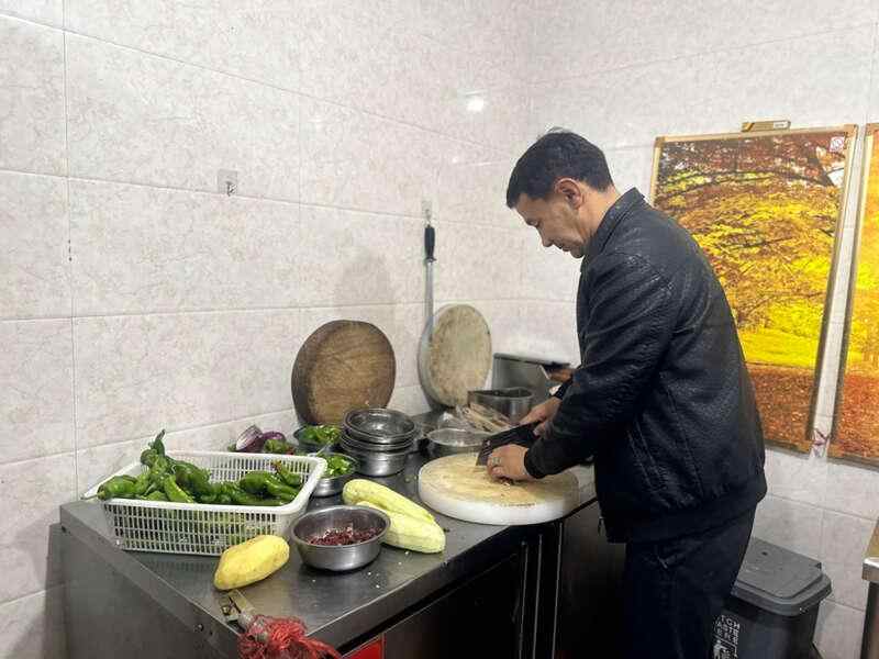 11月6日,牧家乐老板伊麦·艾力制作马肠子。中青报·中青网记者 石佳/摄