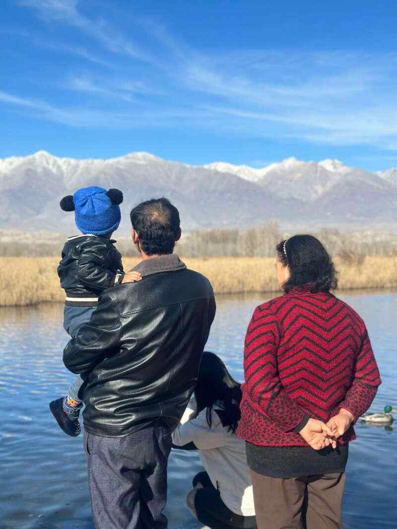 11月6日,博格达尔村一户村民在村口处的湿地公园欣赏美景。中青报·中青网记者 石佳/摄走进口岸看新疆|新疆博格达尔村:文旅融合“解锁”流量密码