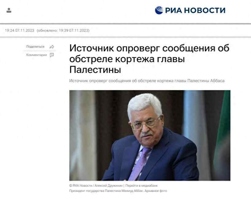 随后,据俄新社报道称,巴勒斯坦总统府一名消息人士接受该媒体采访,否认了关于“巴勒斯坦总统阿巴斯车队遭到袭击”的消息。
