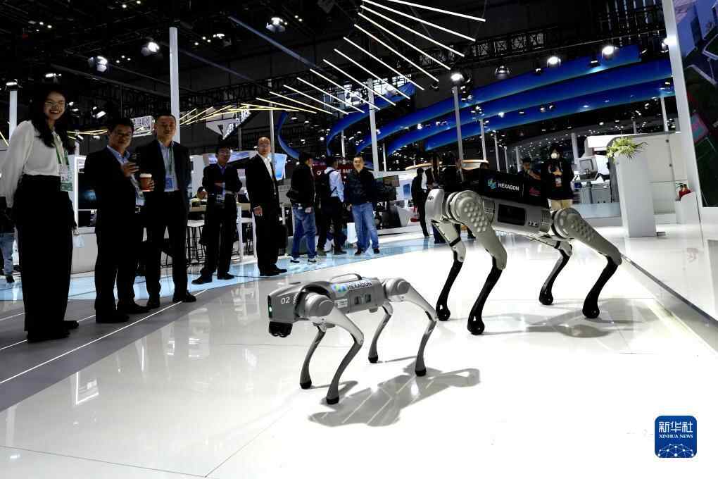 11月7日,在第六届进博会技术装备展区,观众在观看海克斯康展示的智能机器狗。