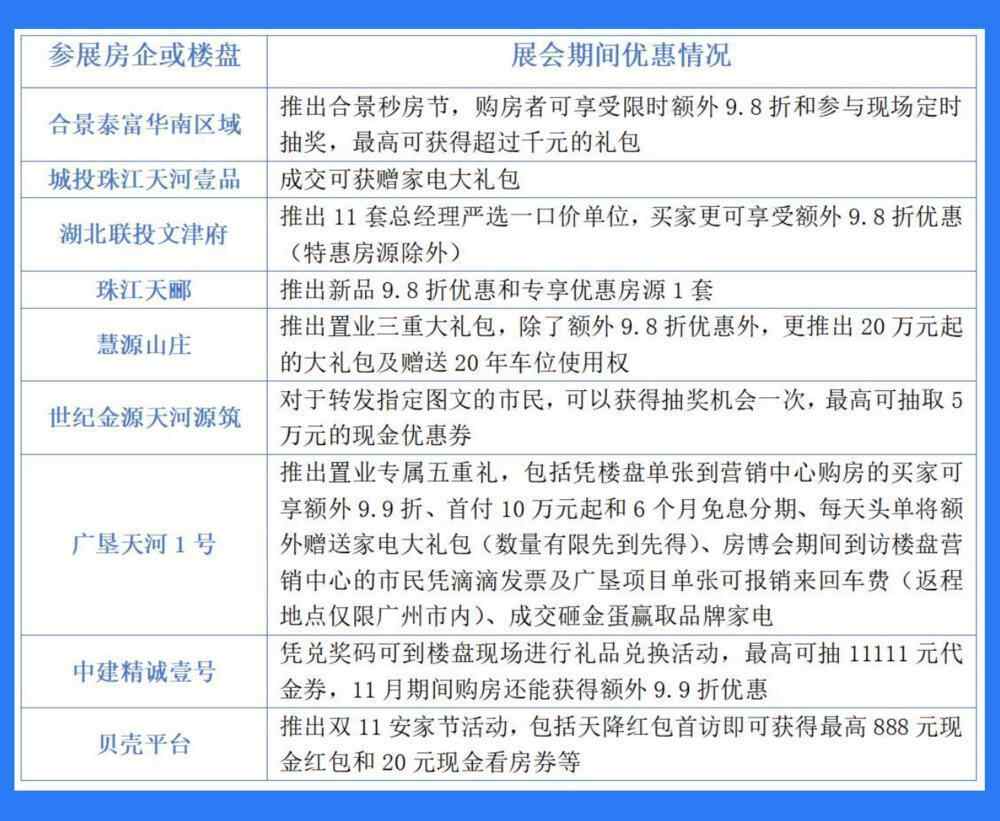 据了解,此次展会云集了包括保利地产、广州城投、珠江实业、中建地产、珠光集团、珠江地产、湖北联投、合景泰富、广垦集团、世纪金源、慧源山庄、贝壳等知名房地产企业和房产服务平台,可以让市民实现一站式逛展、一站式消费。
