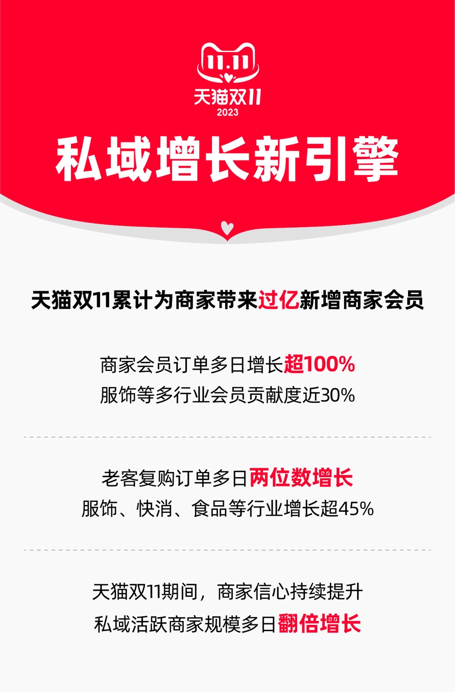 私域关系的爆发,为商家带来了实实在在的订单。天猫“双11”期间,淘宝天猫平台商家会员订单多日增长超100%,包括服饰在内的多个行业表现亮眼,会员人群贡献度近30%。