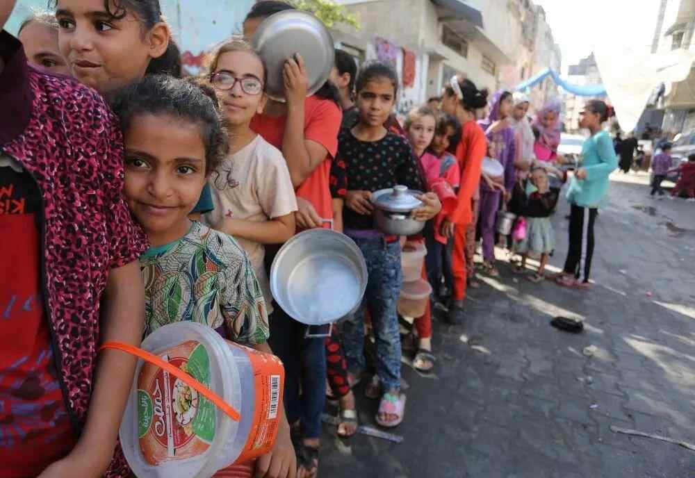 11月9日,在加沙地带南部城市拉法,人们在一个临时分发点排队领取食物。新华社发(哈立德·奥马尔摄)