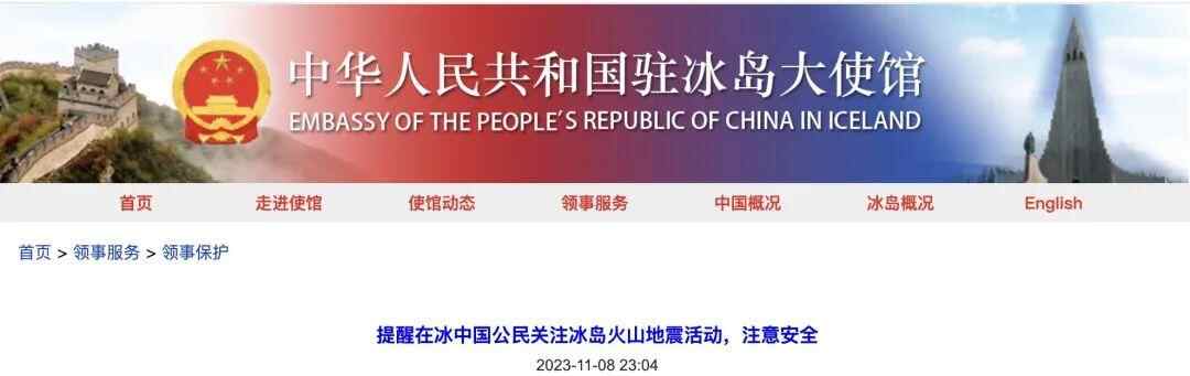 8日,中国驻冰岛大使馆在官网发布《提醒在冰中国公民关注冰岛火山地震活动,注意安全》,全文如下: