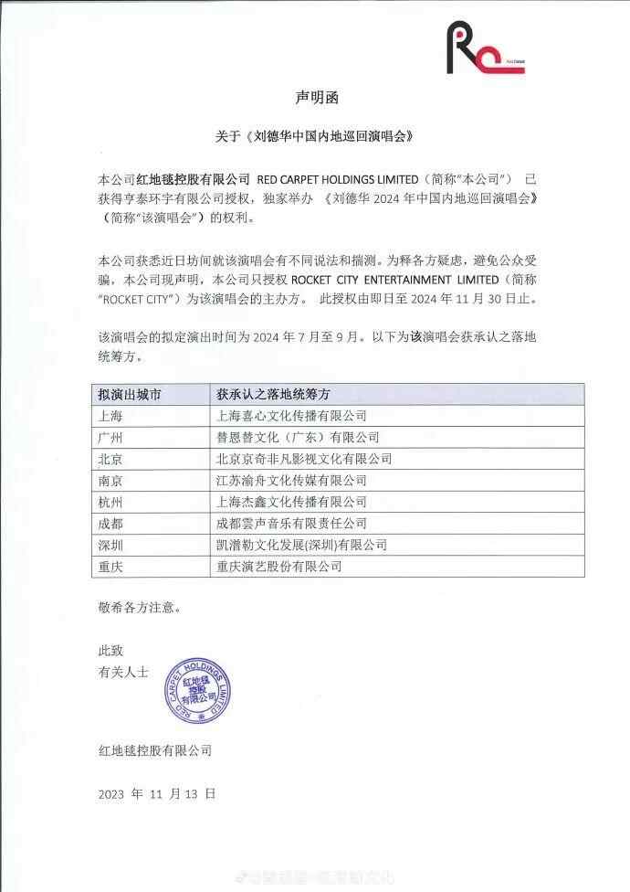 11月14日,获得《刘德华2024年中国内地巡回演唱会》独家举办权的红地毯控股有限公司通过声明函,官宣了刘德华巡演将于明年7月至9月途经上海、广州、北京、南京、杭州、成都、深圳和重庆。具体演出时间及举办场馆,将由落地统筹方确认。