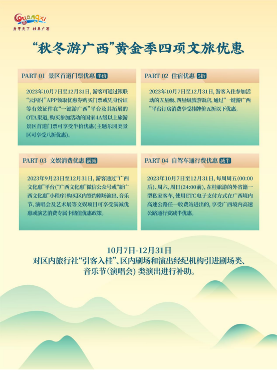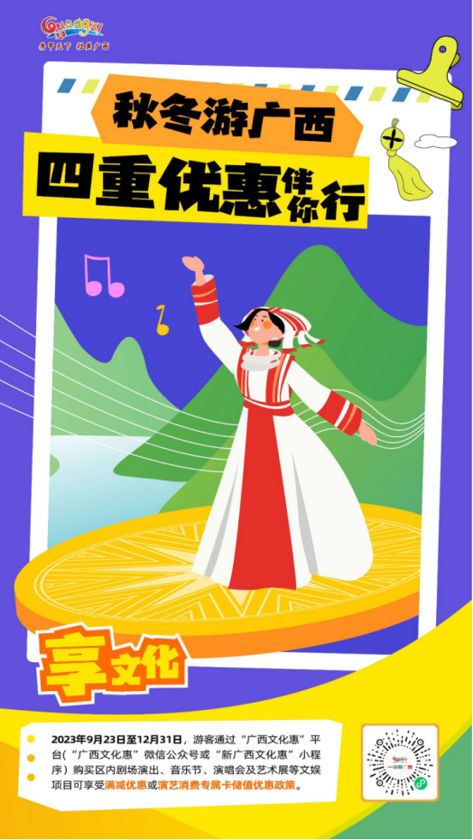 2023年9月23日至12月31日,游客通过“广西文化惠”平台(“广西文化惠”微信公众号或“新广西文化惠”小程序)购买区内签约剧场演出、音乐会、演唱会及艺术展等文娱项目可享受满减优惠或演艺消费专属卡储值优惠政策。