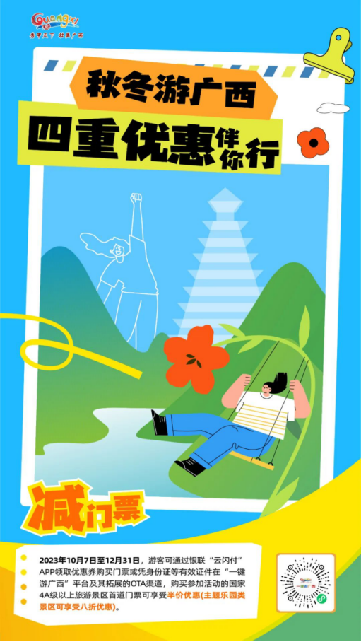 2023年10月7日至12月31日,游客可通过银联“云闪付”APP领取优惠券购买门票或凭身份证等有效证件在“一键游广西”平台及其拓展的OTA渠道,购买自愿参加活动的国家4A级以上旅游景区首道门票可享受半价优惠(主题乐园类景区可享受八折优惠)。