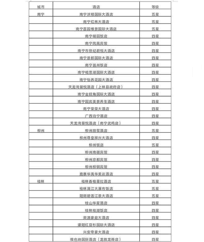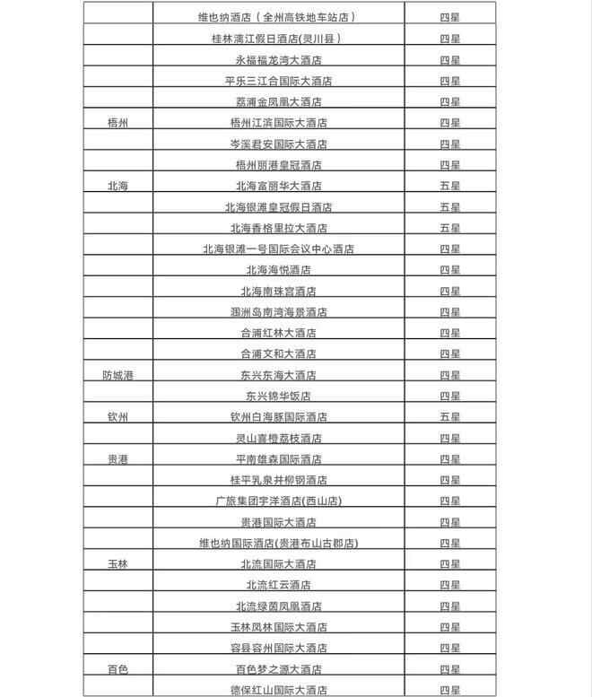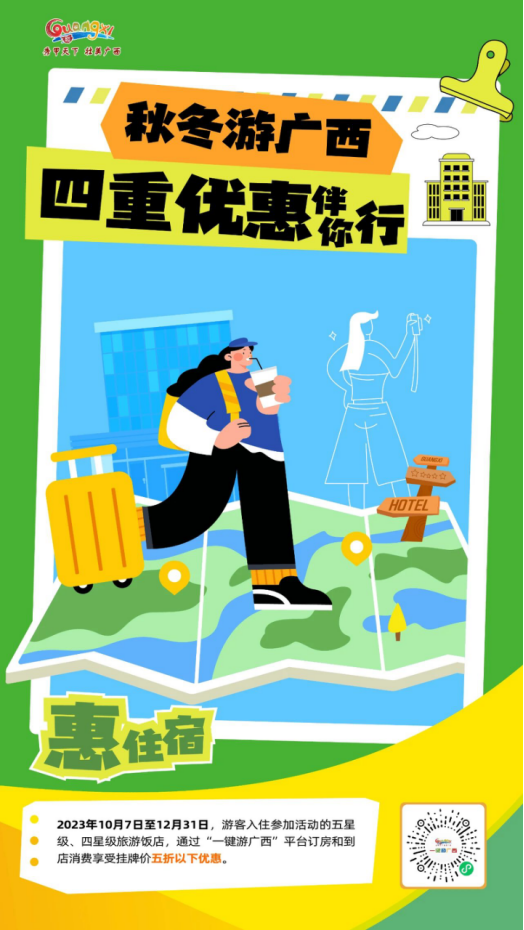2023年10月7日至12月31日,游客入住参加活动的五星级、四星级旅游饭店,通过“一键游广西”平台订房消费享受挂牌价5折以下优惠。