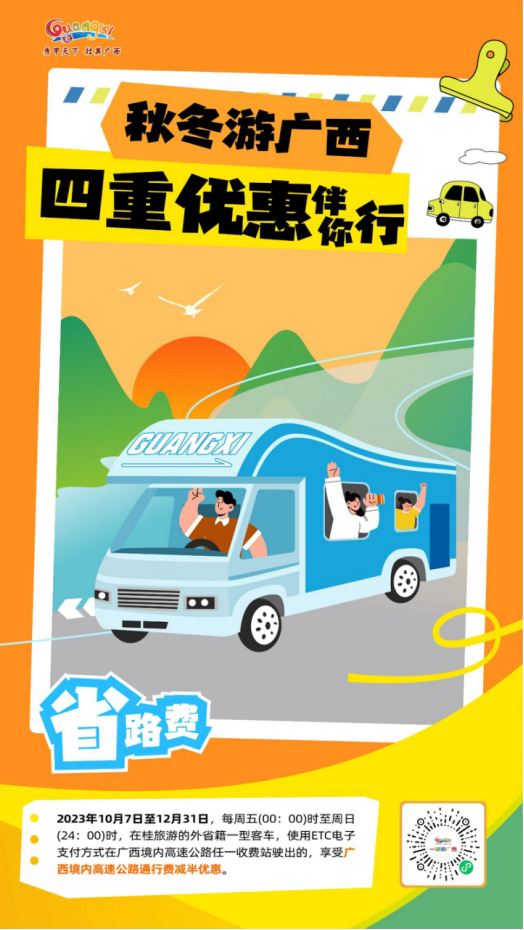 2023年10月7日至12月31日,每周周五(00:00后)、周六、周日(24:00前),在桂旅游的外省籍一型私家客车,使用ETC电子支付方式在广西境内高速公路任一收费站进出的,享受广西境内高速公路通行费减半优惠。
