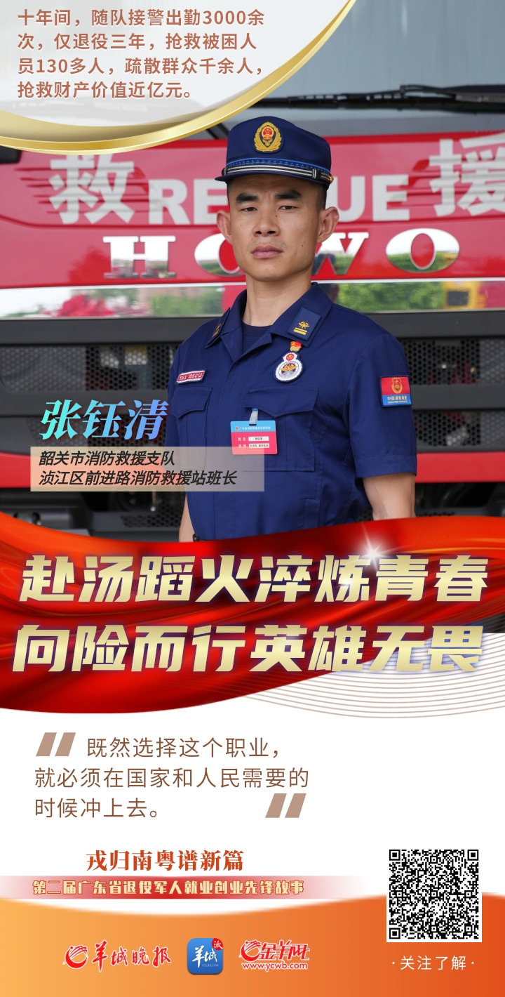 十年间,张钰清先后随队接警出勤3000余次,在消防救援一线用生命诠释担当,多次被支队评为“执勤训练标兵”“优秀士兵”,荣立个人一等功一次,并先后荣获“广东省向上向善好青年”“全省防汛防旱防风防冻先进工作者”“韶关最美退役军人”等荣誉。