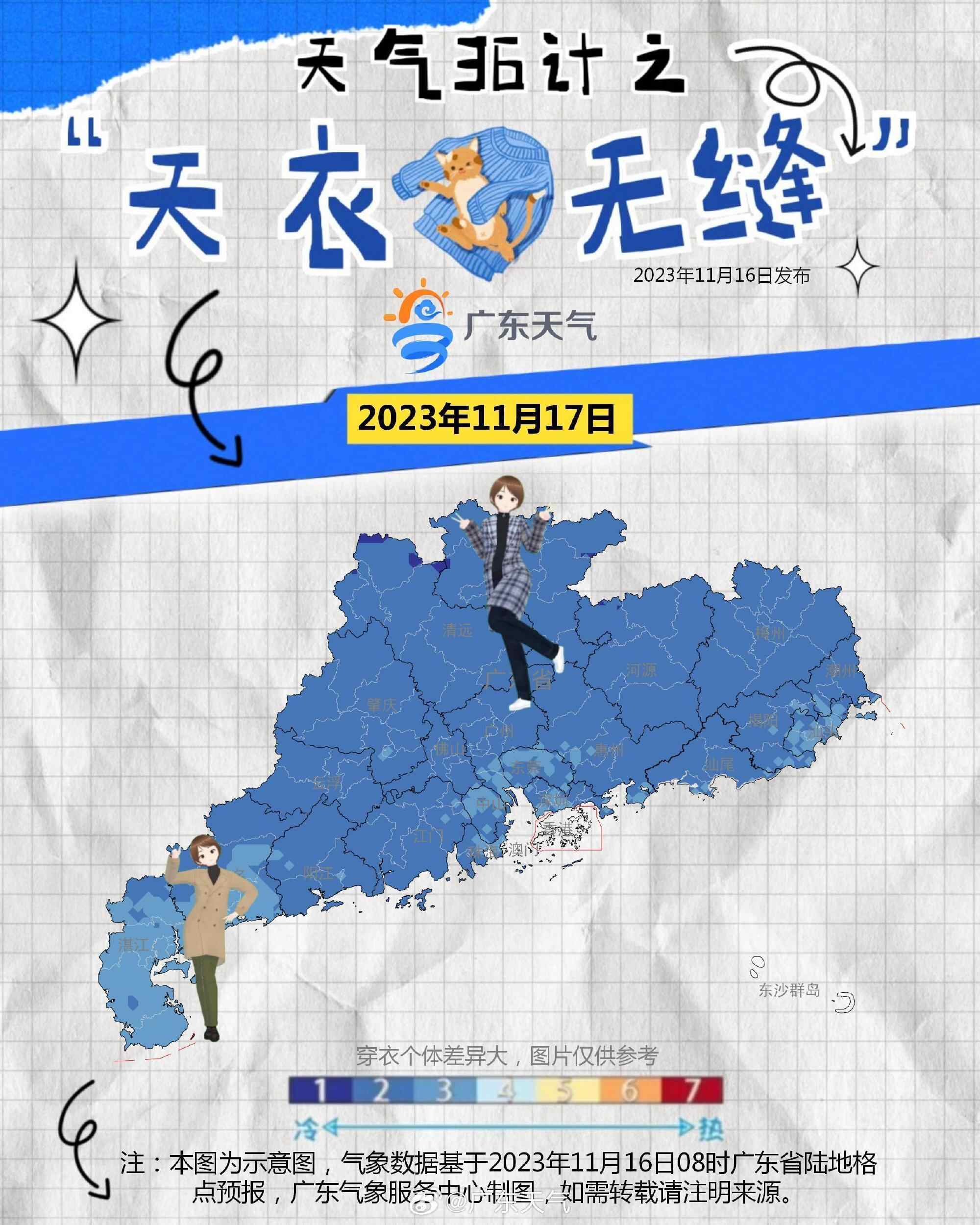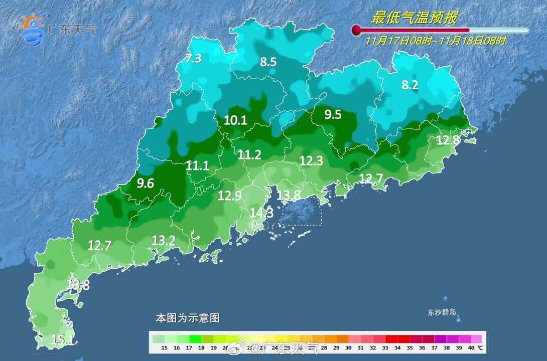 17日,广东省大部市县多云到晴天。早晨最低气温:粤北、肇庆、和云浮市县6℃~9℃(高海拔山区3℃~5℃),南部沿海市县14℃~17℃,其余大部分市县9℃~13℃。