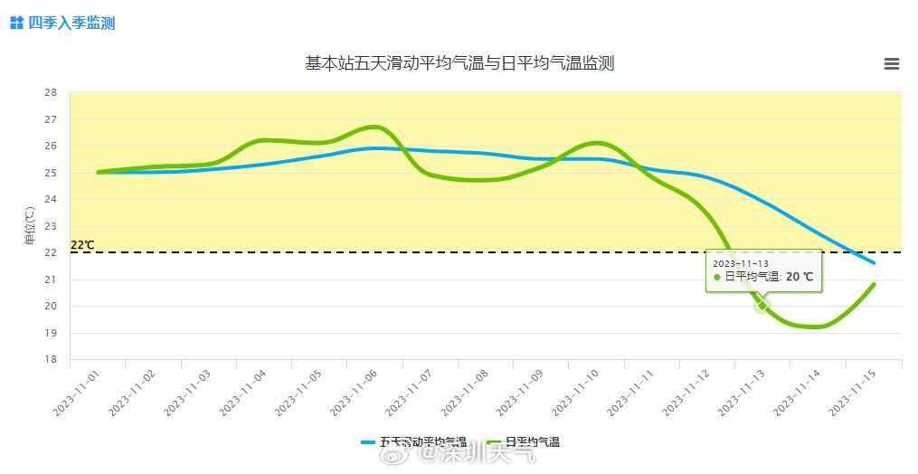 11月16日,@深圳天气 发布微博称,根据深圳国家基本气象站监测数据,深圳2023年11月11日-15日五天滑动平均气温为21.6℃(满足≤22℃的气象入秋标准),五天中首个日平均气温≤22℃为11月13日(20.0℃),即深圳于11月13日入秋,较常年平均入秋日(11月8日)偏晚5天。