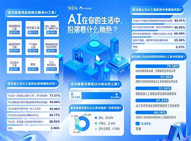 记者调查显示,79.38%受访者表示AI工具的发展很有必要,但同时要做好监管和治理。59.65%受访者表示担心AI工具使用不当可能造成一定的风险,包括不法分子利用AI工具犯罪(83.47%);一些人利用AI生成作品,破坏良性竞争秩序(66.02%);一些人用AI工具制造虚假信息,损害他人利益和公共利益(60.44%);滥用AI工具造成侵权(55.93%)。