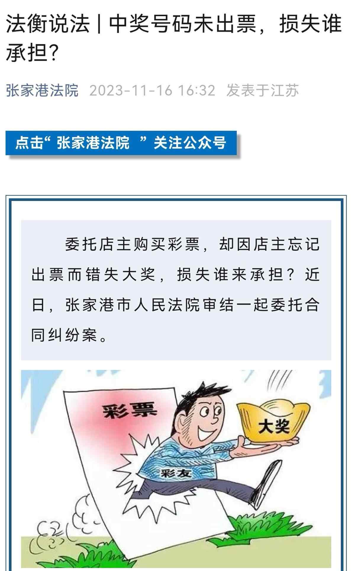付款委托店主购买彩票,中了500万元,却因店主忘出彩票而错失大奖,法院判彩票店赔偿24万元损失。11月16日,江苏张家港市人民法院公布了这一委托合同纠纷案。