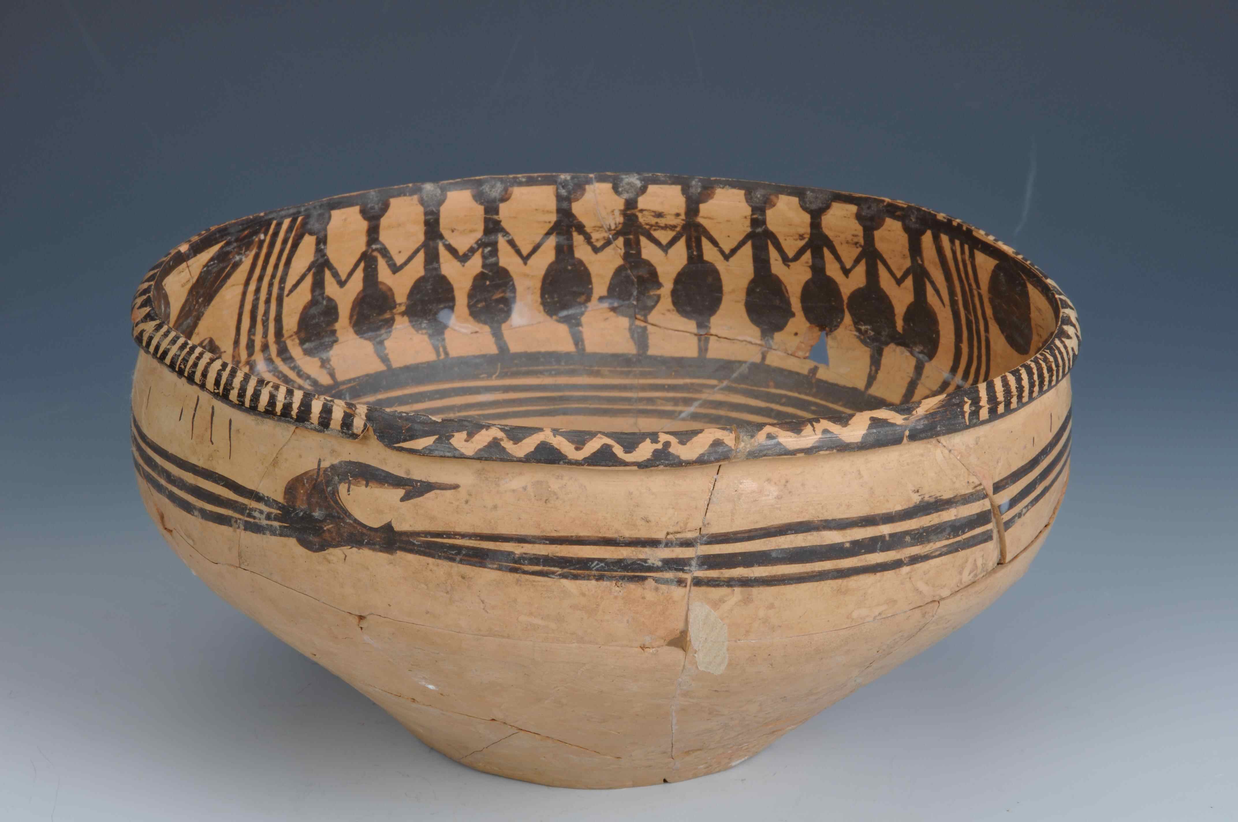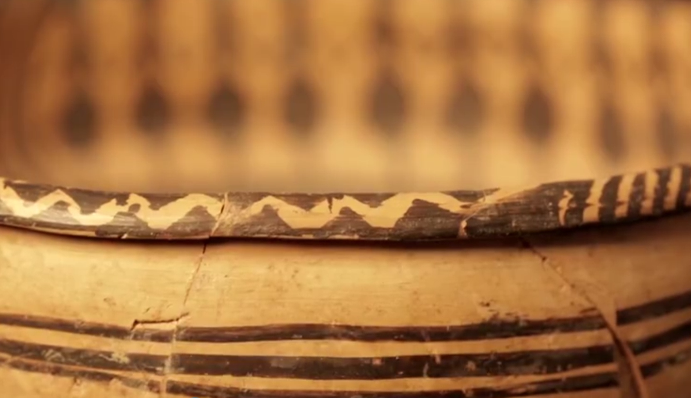 口沿处绘有成组的对顶三角纹和短斜线纹