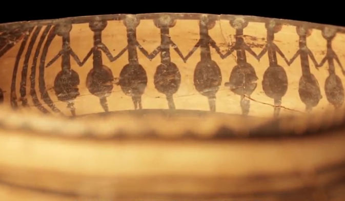 两组舞蹈人像之间用弧线、斜线和圆点相隔