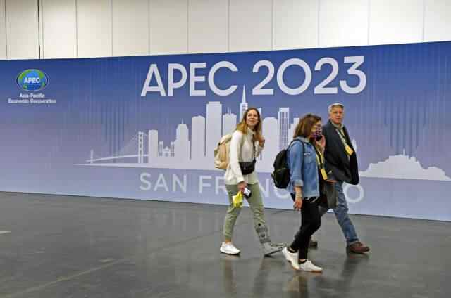 11月12日,在美国旧金山,记者经过2023年亚太经合组织会议国际媒体中心内的一幅海报。新华社记者 李睿 摄