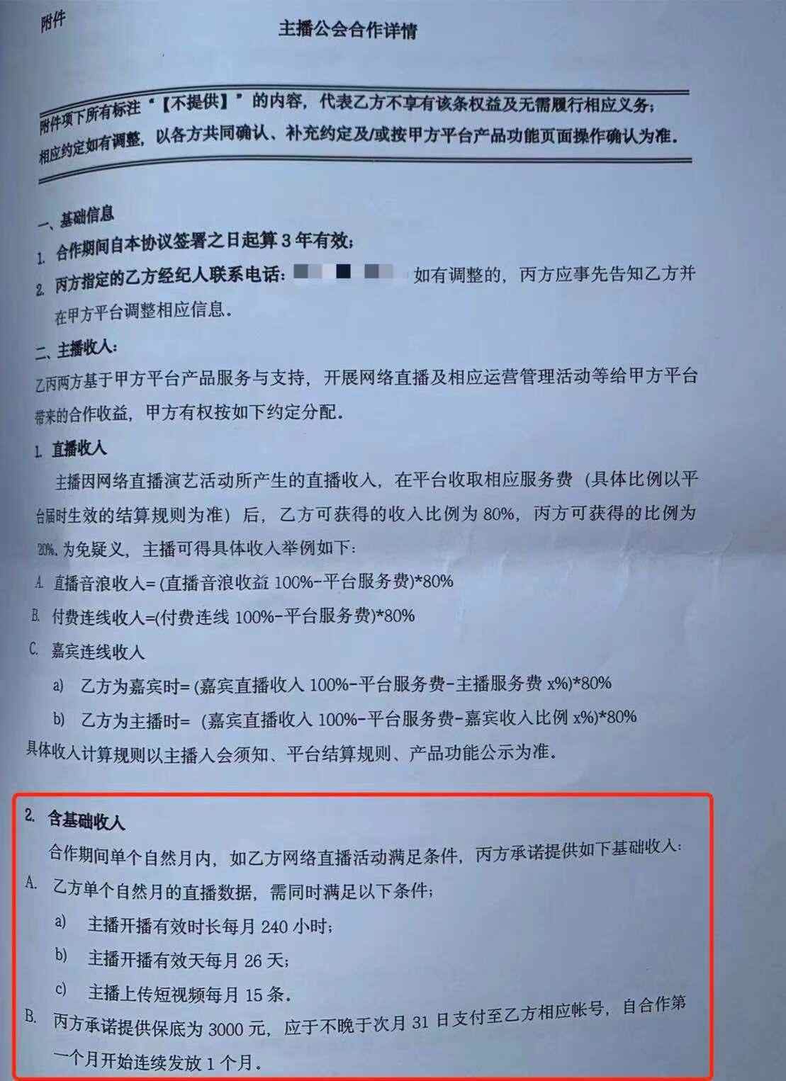 为什么孩子会那么拼命直播?从李昊和公司签署的《主播及公会合作协议》(以下简称《协议》)上,李永成看出了端倪。《协议》规定,主播每月保底收入3000元,但要求开播有效时长需达到每月240小时、开播有效天数达到每月26天、主播上传短视频每月15条。